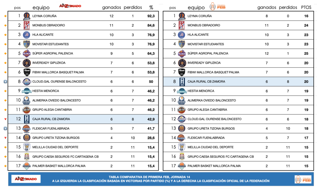 - Clave: Esta temporada la configuración de la Primera FEB está determinada por 17 equipos, dos de los cuales ascenderán y otros dos perderán la categoría. Esta «irregularidad» de liga impar, obliga a descansar a un equipo cada jornada por lo que la clasificación real no es la que publica la federación, la siguiente tabla basada en porcentajes de victoria es más ajustada.