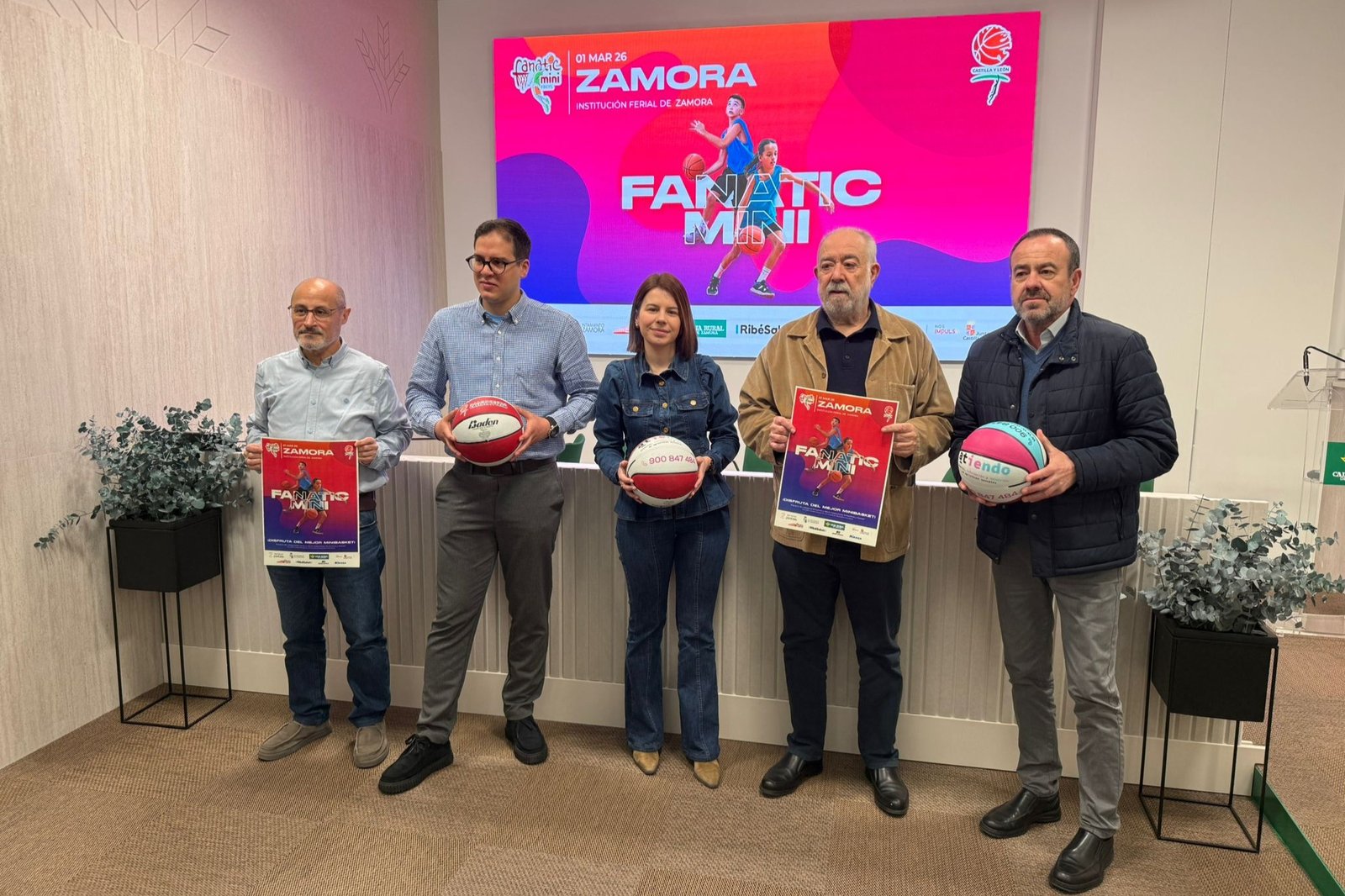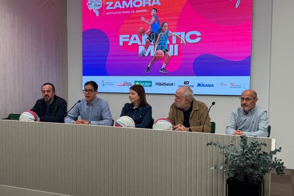 Óscar Castañeda (presidente de la Federación de Baloncesto de Castilla y León), José Manso (delegado de la FBCyL en Zamora), Pablo Novo (concejal del Ayuntamiento de Zamora), Laura Huertos (Departamento de Imagen, Comunicación y Relaciones Institucionales de Caja Rural de Zamora) y Lorenzo Jiménez (director de IFEZA), se reunían para dar visibilidad a este evento el pasado lunes y en el que participarán 34 equipos, procedentes de distintos puntos de la comunidad autónoma, «más de 400 niños y niñas se darán cita en Zamora para disfrutar de su deporte favorito en una jornada que volverá a convertir a la ciudad en el epicentro del minibasket regional«.