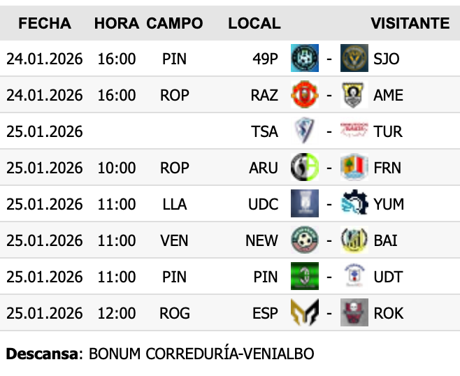 La igualdad volvió a reflejarse en el empate 2-2 entre Bonum Correduría–Venialbo y Yumbo, mientras que UD Tordesana–Bar Benito se llevó un triunfo ajustado y emocionante ante Razing Duero (4-3). Completaron la jornada las victorias de Bajozam sobre Arumez (3-1) y de Talleres Saludes–Ramos Asesores frente a SJO–Noxball (3-5).